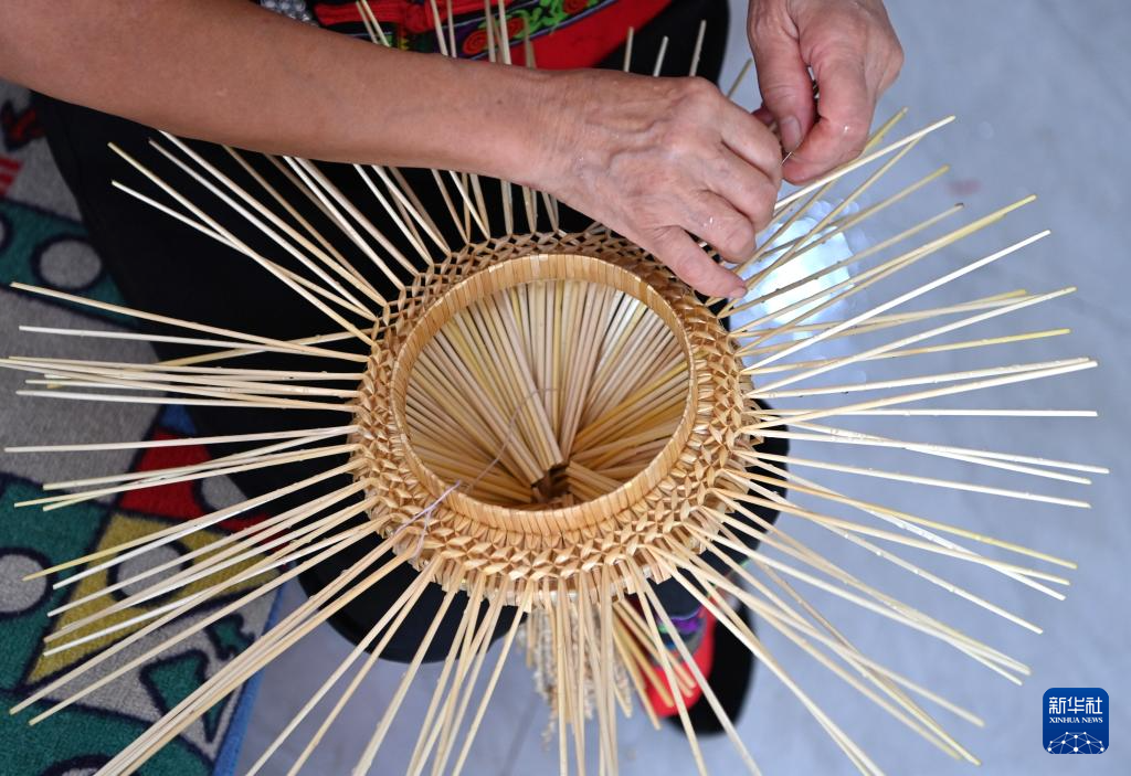 梁秀群在百色市田阳区巴别乡三坡村自家门前将竹篾定型(8月21日摄)。