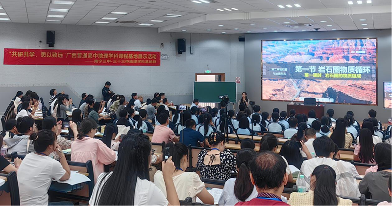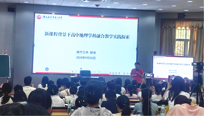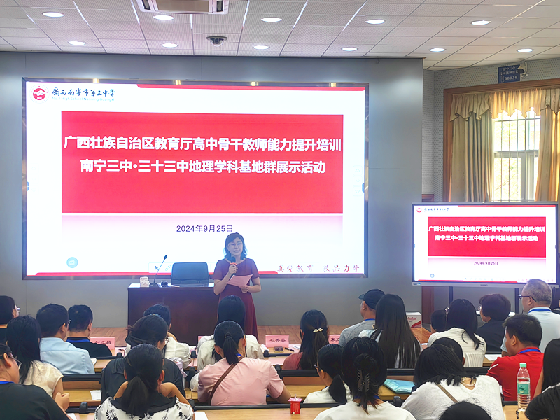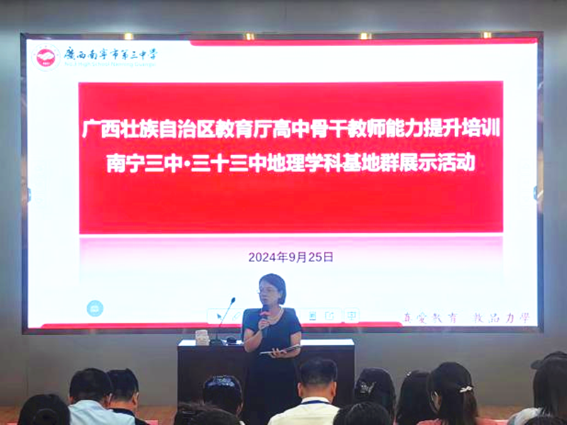 秋分恰过,昼夜均长,正是收获与希望并蓄的美好时节。2024年9月25日,广西壮族自治区教育厅主办的高中骨干教师能力提升培训活动、地理学科课程基地展示活动在南宁市第三中学顺利举行。本次活动以“共研共学,思以致远”为主题,汇聚了区内众多教育精英,共同探索教育领域的无限潜力与广阔前景。