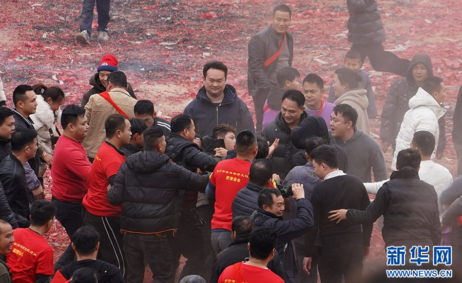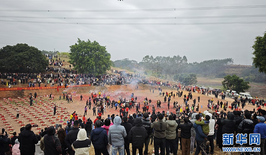 抢花炮比赛中,各支花炮队的队员们各展所长、激烈拼搏,抢“头炮”,沾福运,场面精彩热烈。