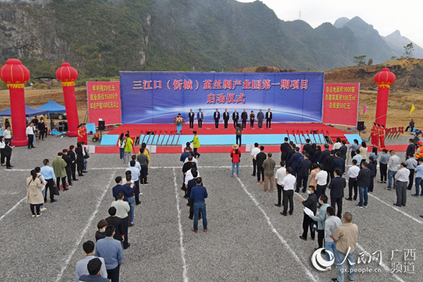 人民网忻城11月18日电 (朱晓玲)11月18日上午,三江口(忻城)茧丝绸产业园项目举行启动仪式。来宾市委常委、忻城县委书记李振品宣布项目启动。项目总投资50亿元,将打造全国单体最大的茧丝绸产业园区。