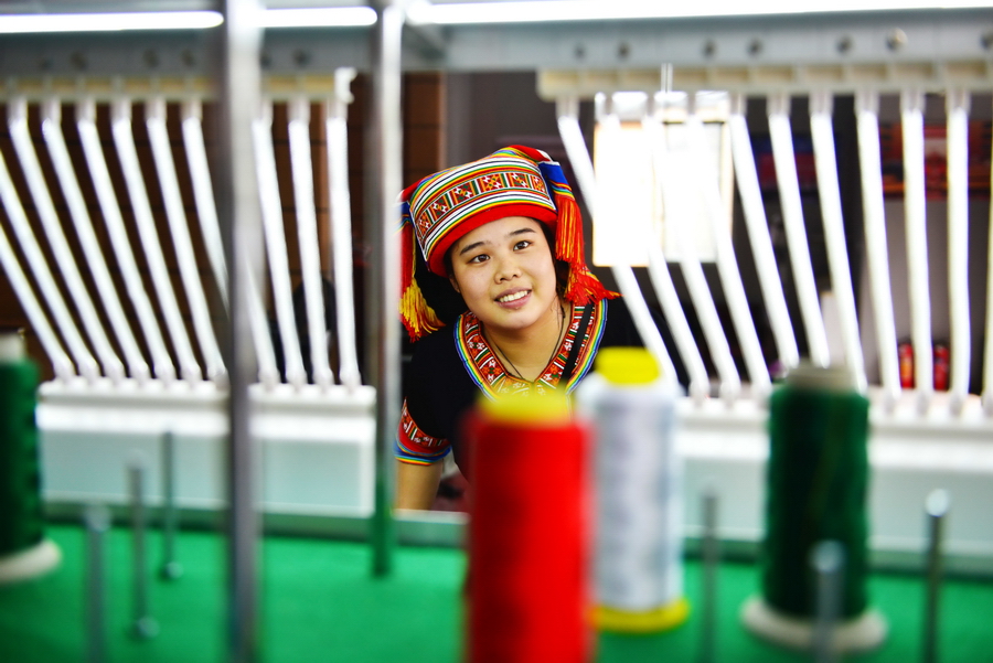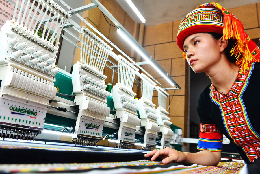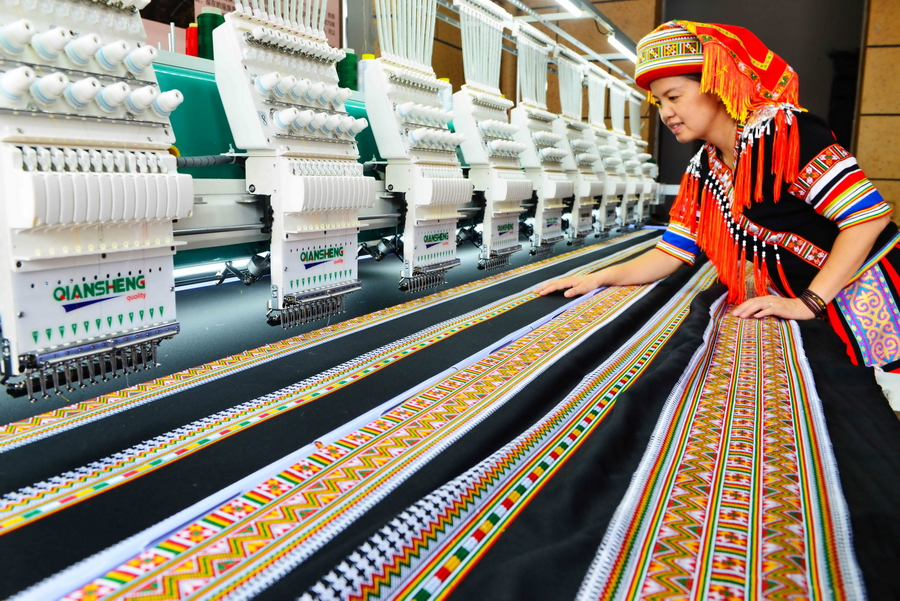 8月8日,在八步区一家瑶族文化体验馆,工人在查看绣花设备生产运行情况。