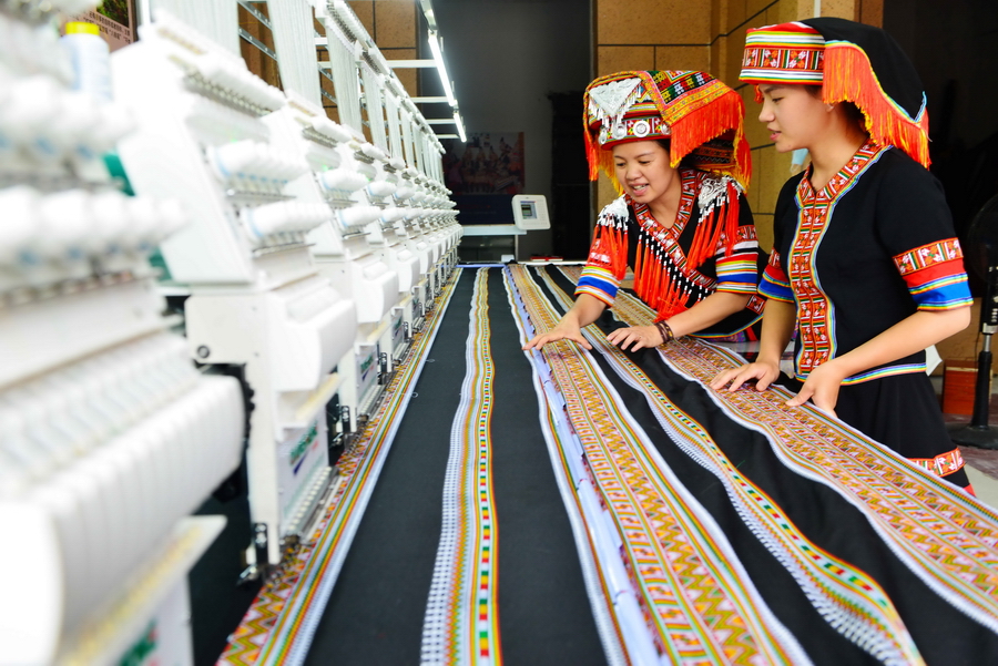 8月8日,在八步区一家瑶族文化体验馆,国家级“非遗“瑶族服饰传承人李素芳(左)和工人在查看绣花设备运行情况。