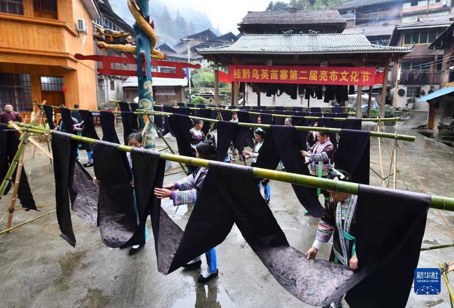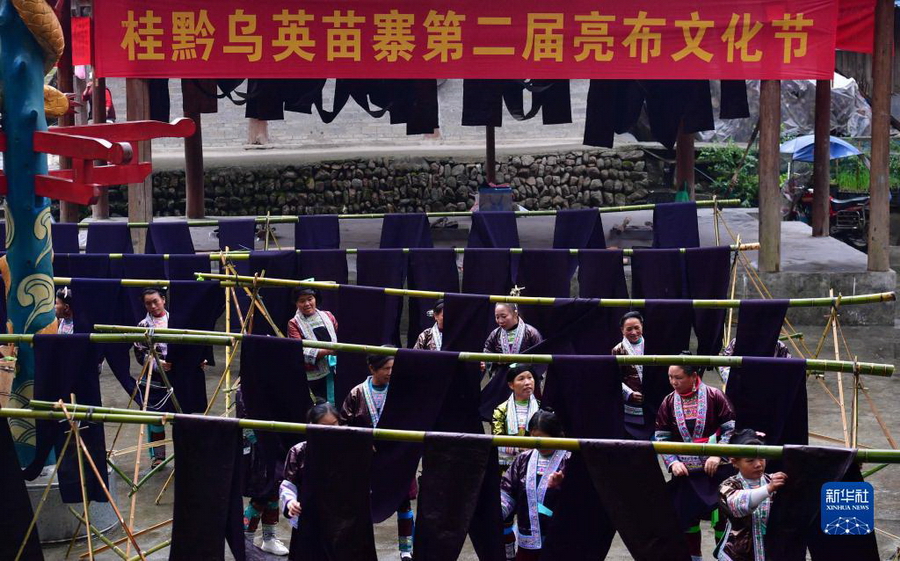 10月19日,在桂黔乌英苗寨亮布文化节上,苗族妇女在悬挂亮布。