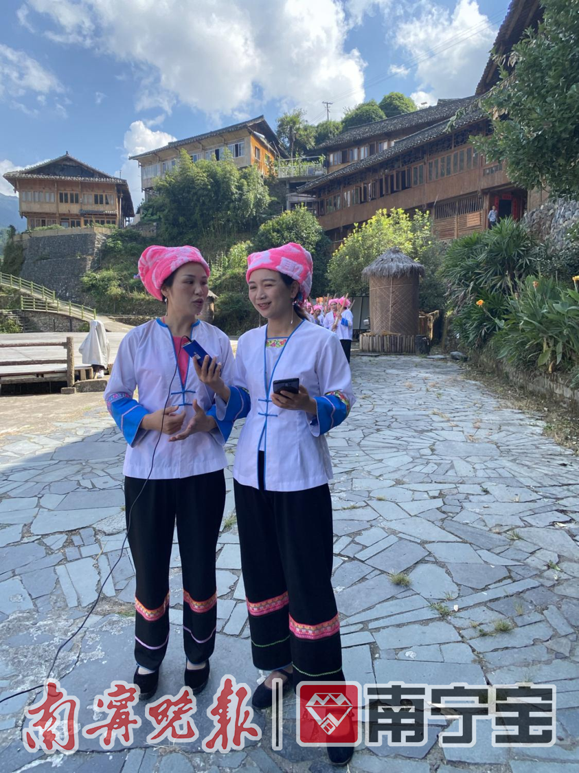 蒋凤(右)在桂林龙胜金竹壮寨和村民直播