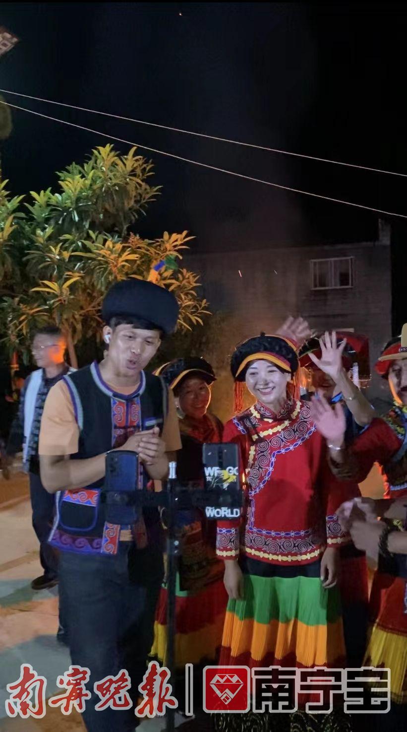 蒋凤(中)在龙胜地灵侗寨直播芦笙表演
