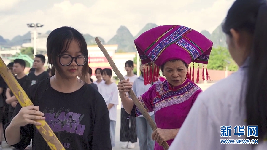覃素芳与其他传承人在交流“壮族打扁担“技艺