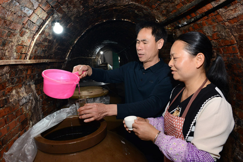 据介绍,精心选取本地优质稻米和山泉水,经过烧饭、上曲、发酵、烧锅、蒸煮等传统工序,带着稻米芬芳的醇香米酒就新鲜出炉。近年来,龙头村在人大代表引领下掀起了酿酒的创业热潮,目前全村已有酒坊46家,年产值400多万元。“采用传统工艺酿造、经过地窖收藏的米酒很受欢迎。回乡过年的乡亲,总说这米酒有着乡愁的味道……“容县人大代表李林强说。