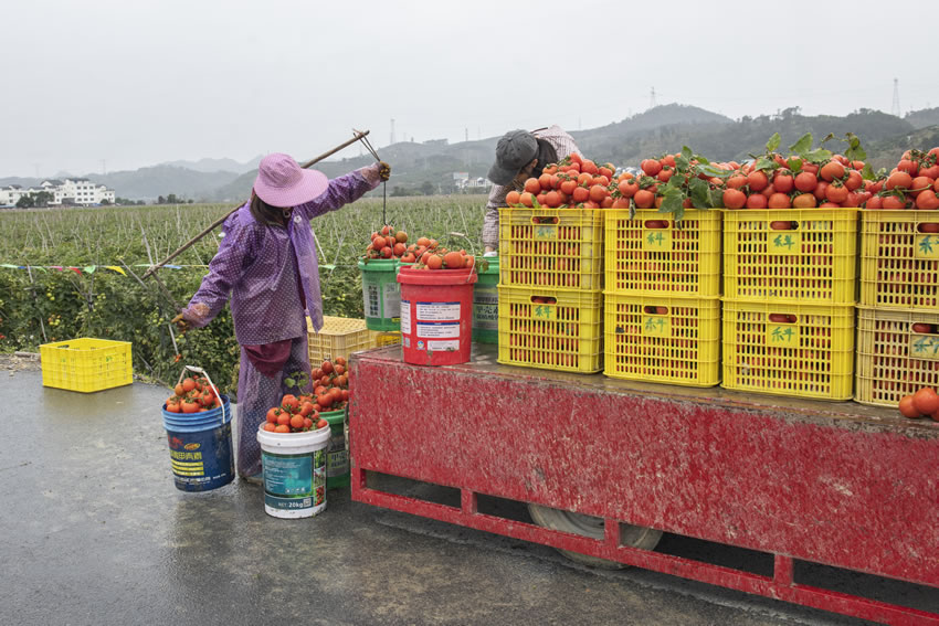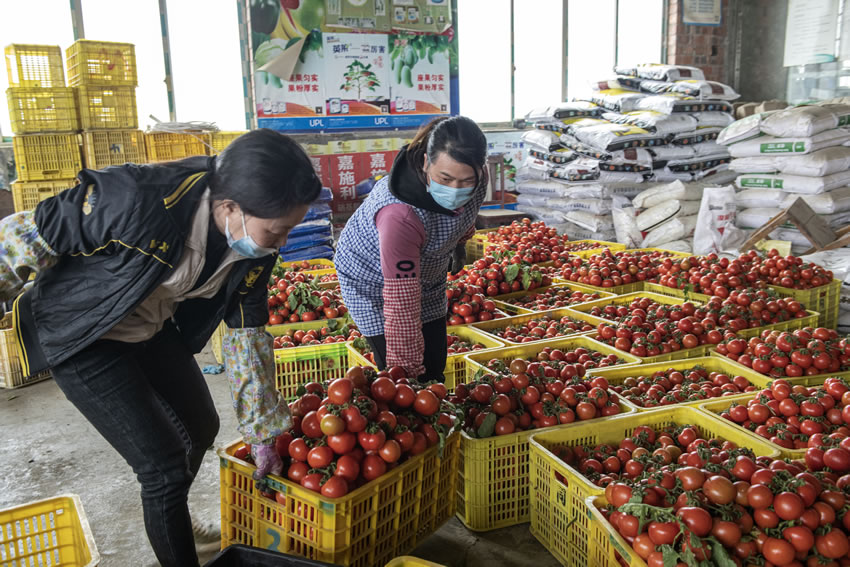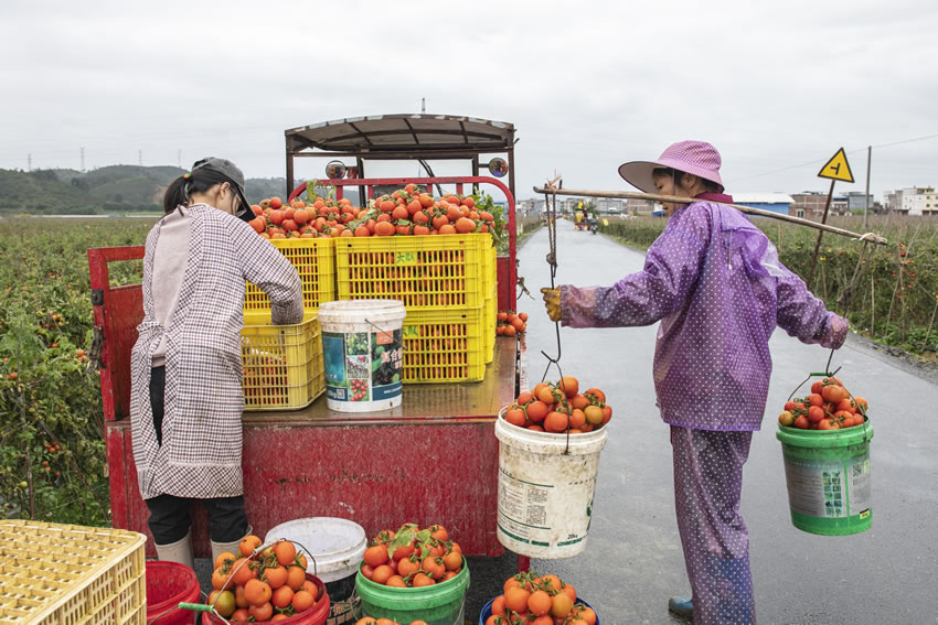 入春以来,田东县平马镇四平村西红柿长势喜人,正值丰收期。随着疫情得到有效控制,陆续有了客商前来收购。近日,虽是冷雨天气,农民群众仍积极性高涨,冒雨抢收西红柿。