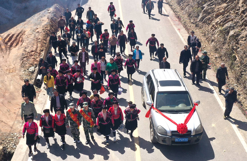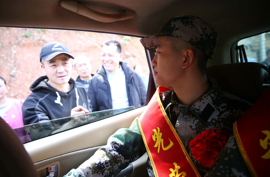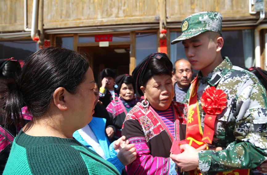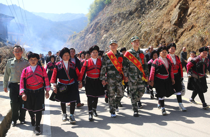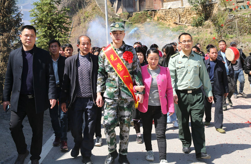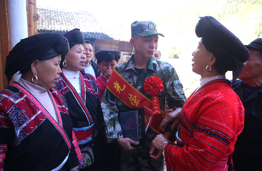 近日,广西龙胜各族自治县龙脊镇中六村下埠屯锣鼓喧天,鞭炮齐鸣,乡亲们身着少数民族盛装,夹道欢送两位新兵入伍。