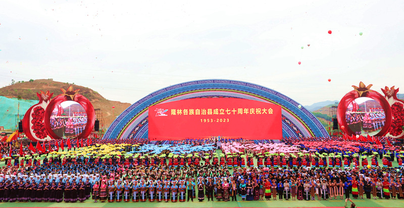隆林各族自治县举行成立七十周年庆祝大会。隆林各族自治县融媒体中心供图人民网隆林3月28日电 (覃心)3月28日上午,广西百色市隆林各族自治县举行成立七十周年庆祝大会。全国人大民委、国家民委祝贺团、自治区代表团、百色市代表团全体成员以及各方嘉宾莅临现场,与数万各族群众共庆隆林各族自治县成立七十周年。全国人大民...