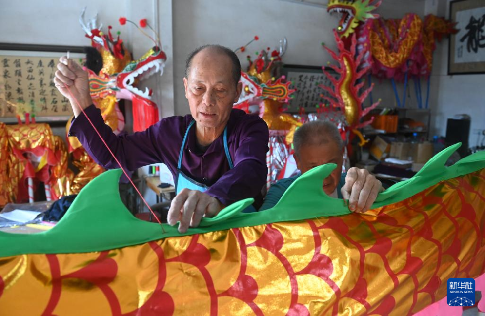 1月16日,在广西宾阳县宾州镇三联街,邹玉特在缝龙布。 1月16日,在广西宾阳县宾州镇三联街,邹玉特在装龙珠。 1月16日,在广西宾阳县宾州镇三联街,邹玉特(左)在挑选扎制炮龙的材料。 1月16日,在广西宾阳县宾州镇三联街,邹玉特在扎制炮龙。 1月16日,在广西宾阳县宾州镇三联街,邹玉特在装龙珠。 1...
