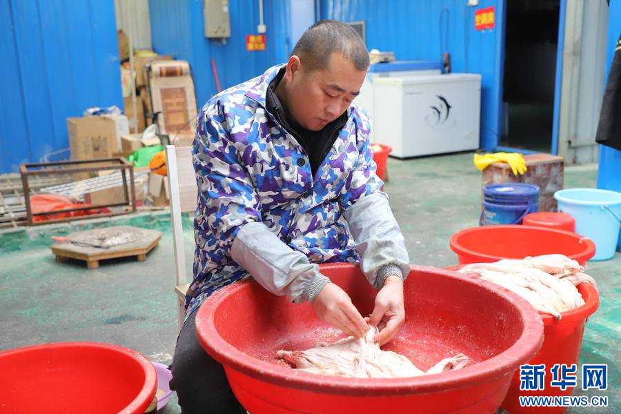 工人腌制腊鸭烘干房里的腊鸭检查腊肠检查腊鸭烘制程度正在烘制的腊肠已经制作好的腊肠 临近龙年春节,广西柳州市融水苗族自治县的各个腊味食品加工厂的工人赶制腊味供应年货市场,一派忙碌的景象。 在位于融水镇横山小区附近的食品加工厂,一名工人正在用食盐、酒、香料...