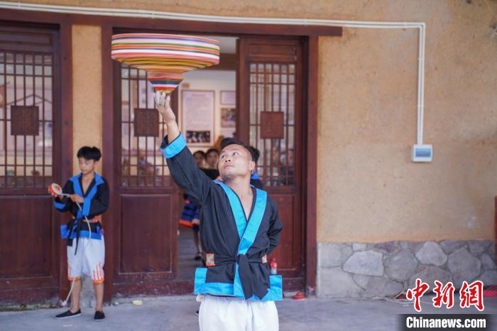 图为白裤瑶族民众为游客展示陀螺在手上旋转。陈冠言 摄 8月30日,在广西河池市南丹县的瑶望天下景区内,白裤瑶族民众为游客展示陀螺技巧技艺。图为白裤瑶族民众为游客展示陀螺在手上旋转。陈冠言 摄图为白裤瑶族民众为游客展示陀螺在头上旋转。陈冠言 摄图为白裤瑶族民众为游客展示陀螺技巧技艺。...