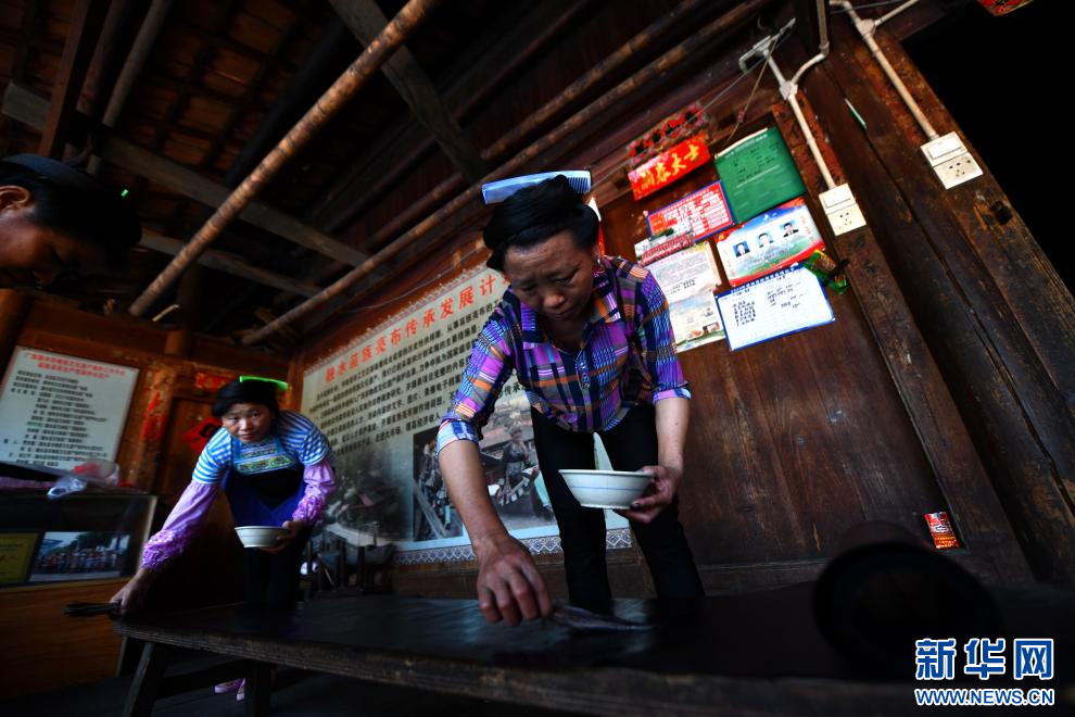 乌英苗寨妇女韦妹丽(右)在给亮布刷蛋清(2020年9月2日摄)。乌英苗寨妇女梁足英(右)在用传统亮布槌捶打布料(2023年8月31日摄)。乌英苗寨妇女梁足英在晾晒第一次浸染后的布料(2023年8月31日摄)。乌英苗寨妇女梁足英(左)、吴妹秋准备缝制亮布衣服,这是吴妹秋在给梁足英量身(2023年8月31日摄)。乌英苗寨妇女吴妹秋...