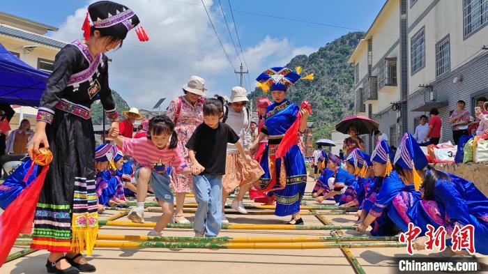 四安村民众与游客共同跳竹竿舞。梁辉业摄中新网来宾7月2日电 (陆原令 王璐颀)“走进锦绣大藤峡畅游绿水仙城”武宣县2023年第二届布濑壮韵文化旅游艺术活动月1日在广西武宣县桐岭镇四安村拉开帷幕。游客在青山绿水环绕的秀美乡村里,观赏体验布濑河蓝靛染布记忆、壮族竹竿舞、山歌传唱、布濑壮百家宴等极具民俗...