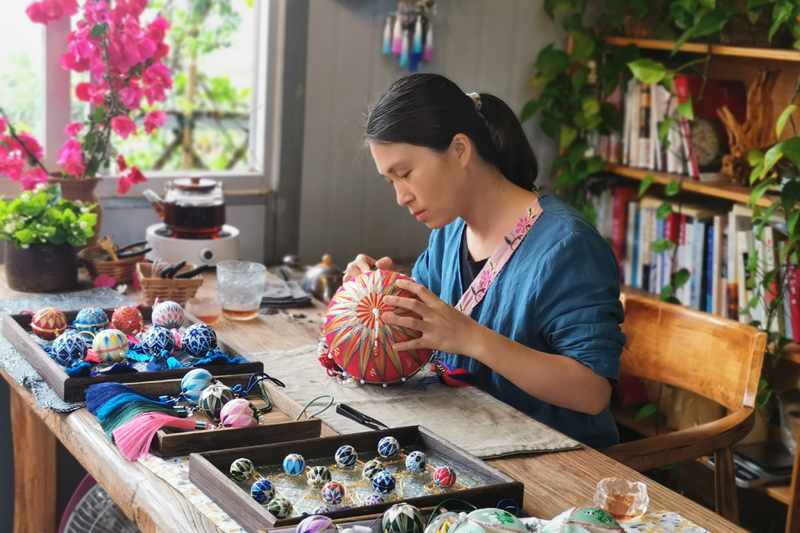 今年“壮族三月三”节日期间,广西各地过节的氛围浓厚。假期前后,横州市茉莉手鞠绣球的订单量不断上涨,绣娘们进入了赶工制作茉莉手鞠绣球的生产热潮中。绣娘正在制作茉莉手鞠绣球。吴彩冰摄 左穿针,右引线,各色丝线在绣娘商霜灵巧的手里变成五彩斑斓的绣球图案。...