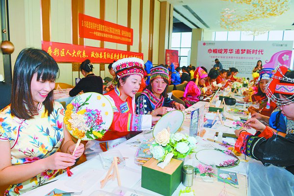 3月7日,蒙山县妇联在长坪瑶族乡民俗文化街瑶绣馆举行庆三八国际妇女节瑶绣活动,20多名女干部职工在瑶绣传承人的指导下练习刺绣技艺。记者 梁乾胜 通讯员 黄胜林 摄 3月7日,中建八局妇联和法援中心在南宁青运村项目部开展慰问活动,为一线女工友解决在权益维护、家庭教育等方面遇到的困难。记...